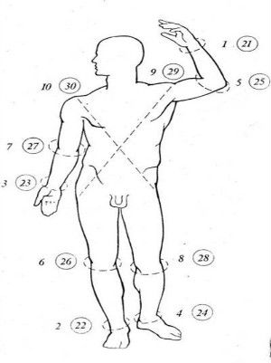 Na slici gore predstavljen je redosled u brojevima u mesecu, kao i mesto na telu gde treba povući zatvorenu liniju.